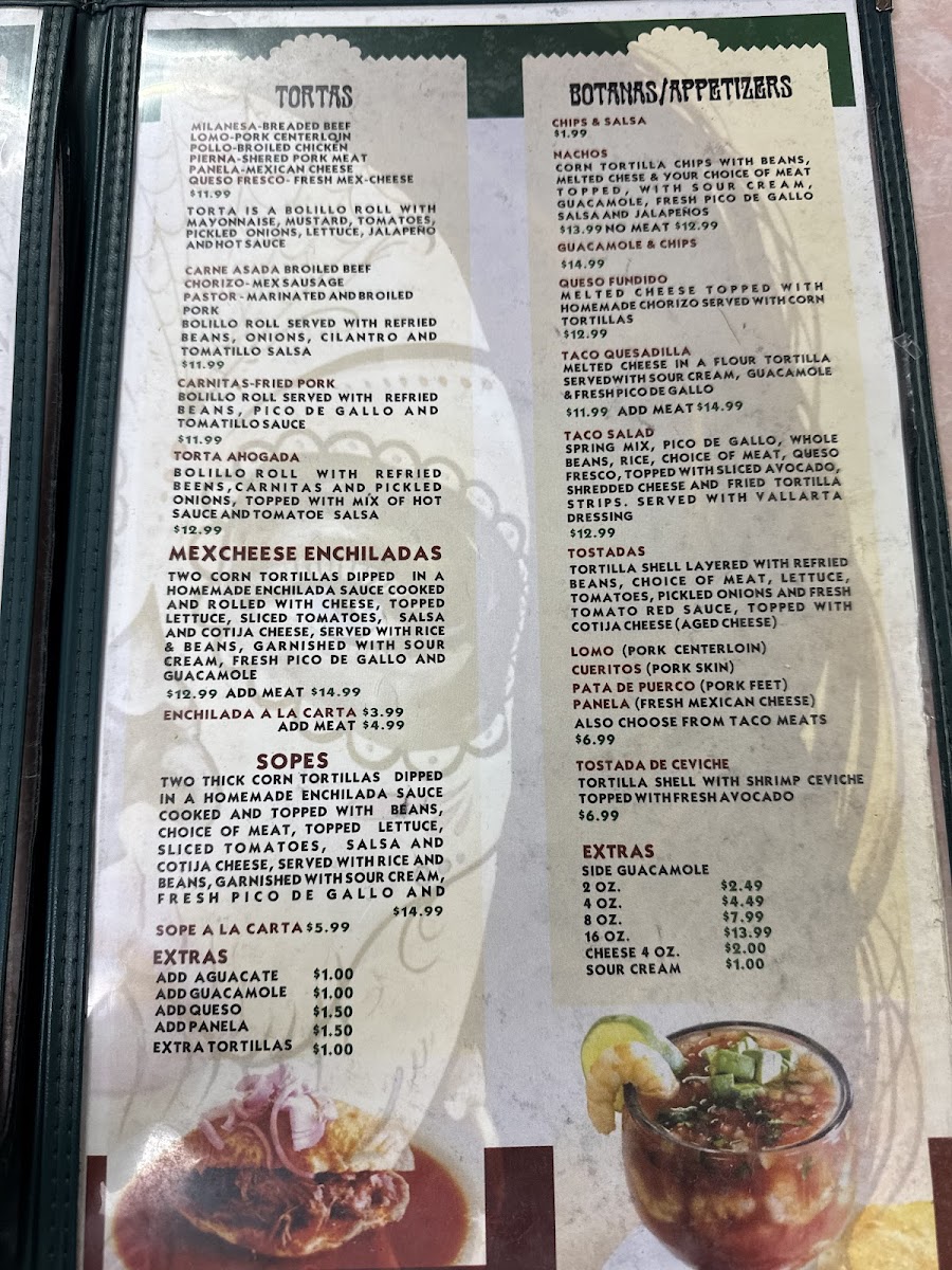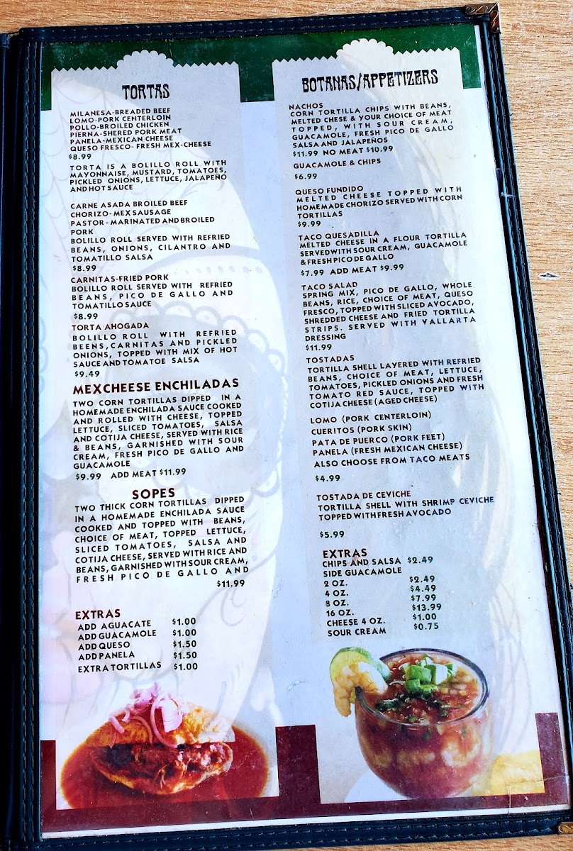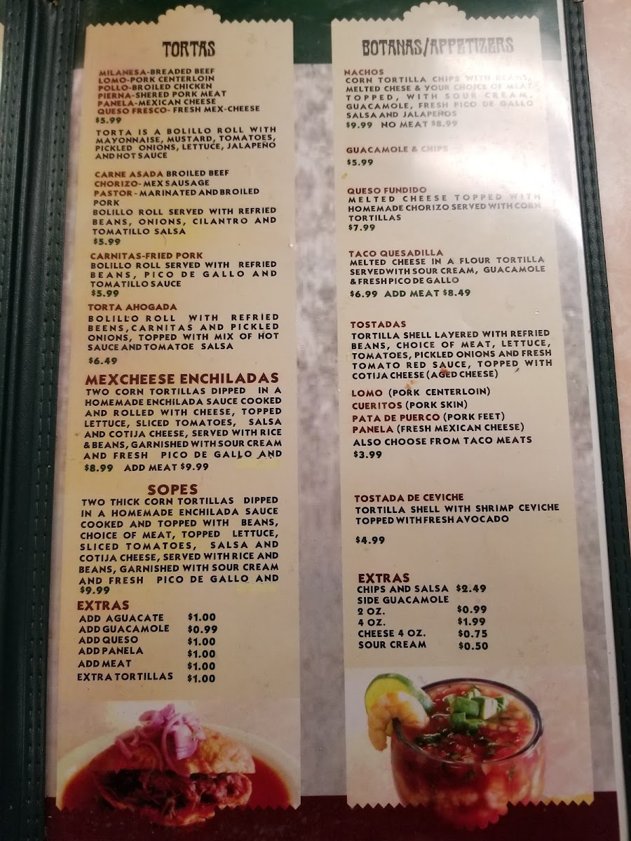 The menu at Los Mexicanos offers a variety of traditional Mexican and Latin American dishes, structured to cater to different meal preferences and times of day. It includes options suitable for breakfast, lunch, and casual dining, with a focus on authentic Mexican flavors.