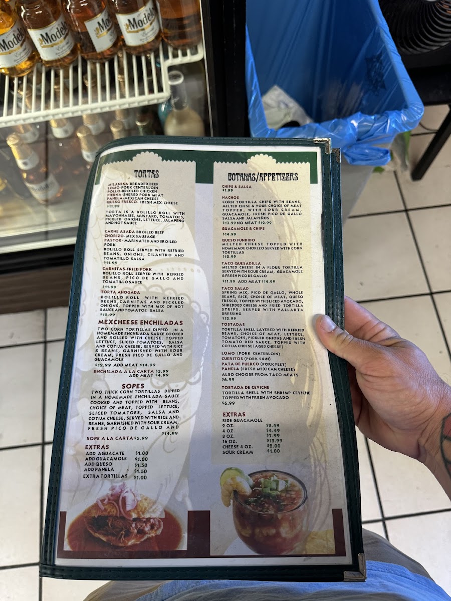 - Tacos and Burritos: A selection of tacos and burritos featuring various meats such as broiled beef, chicken, fried pork, homemade chorizo, beef tongue, and seafood options like grilled fish tacos and shrimp ceviche. These are available in combinations or à la carte, typically served with soft corn or flour tortillas.